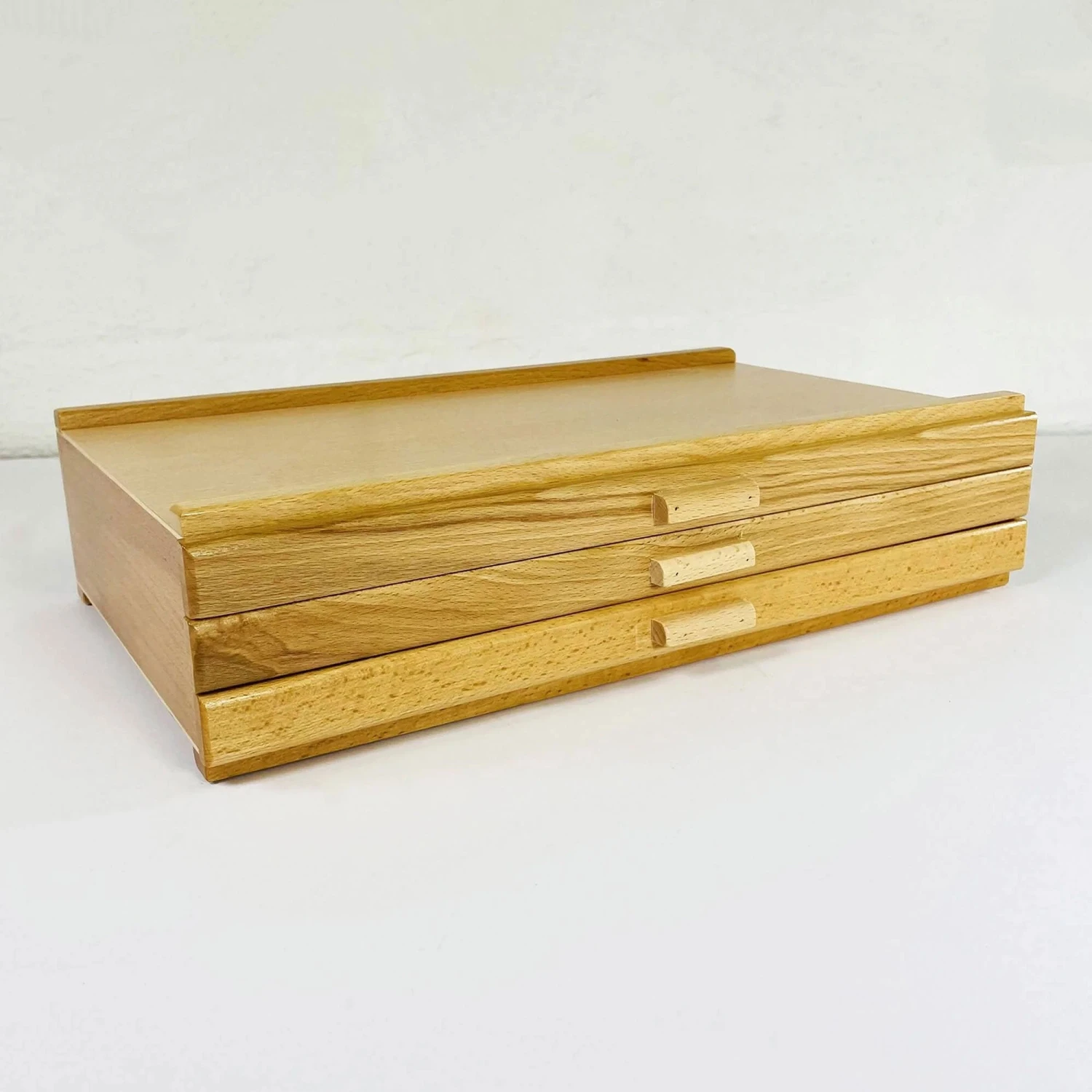The economy 3-drawer cabinet is ideal for storing pastels, pencils, brushes, etc. It is made from oiled beechwood and has approximate dimensions of 400 x 250 x 85mm. It weighs around 2.5 kilograms and has the capacity to hold approximately 129 standard pencils.