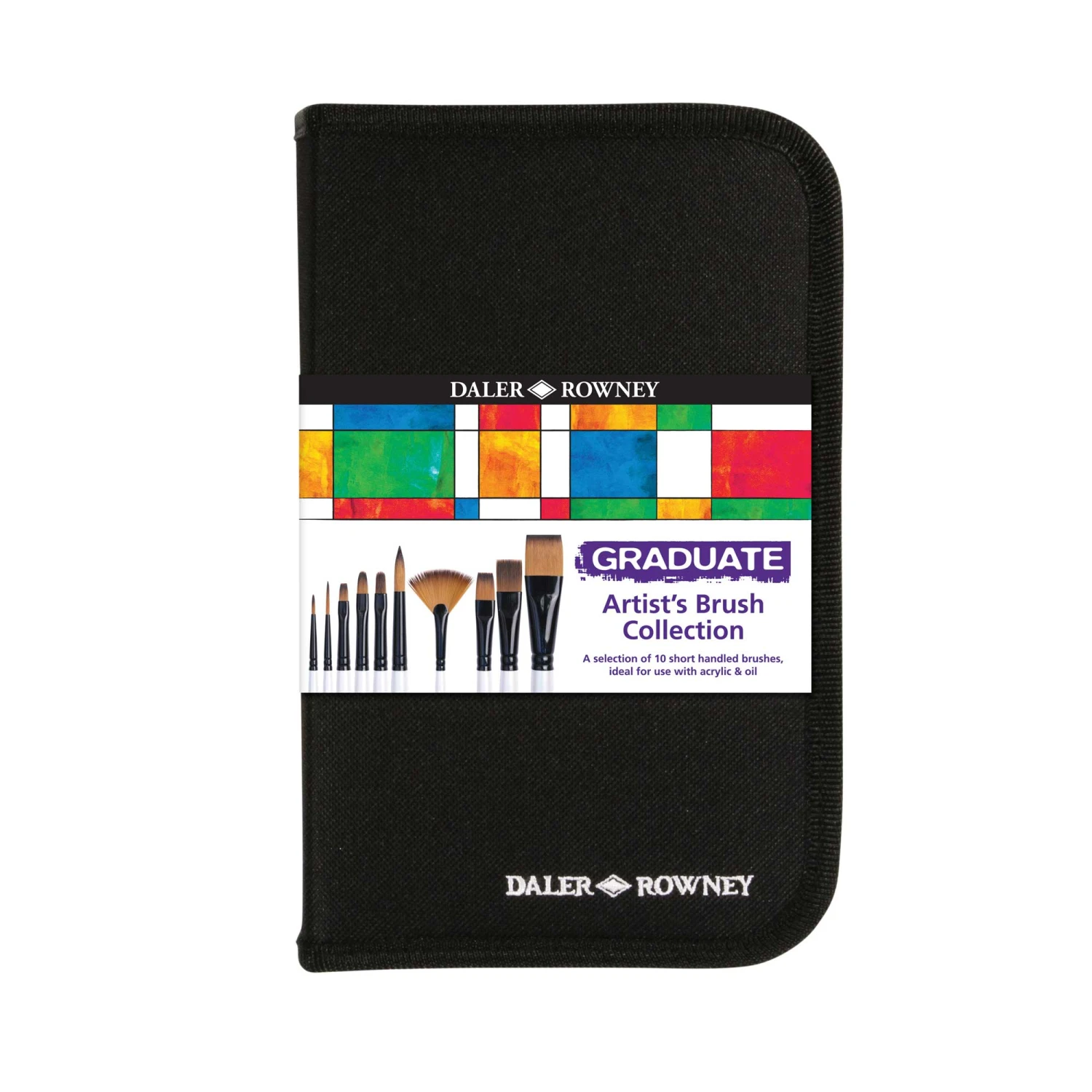 A selection of 10 synthetic, short handled brushes, ideal for use with acrylic and oil. Crafted with care, these brushes are the ideal choice for both budding artists and seasoned art students. With the added benefit of a handy zip case, you can securely store your brushes at home or take them on the go.