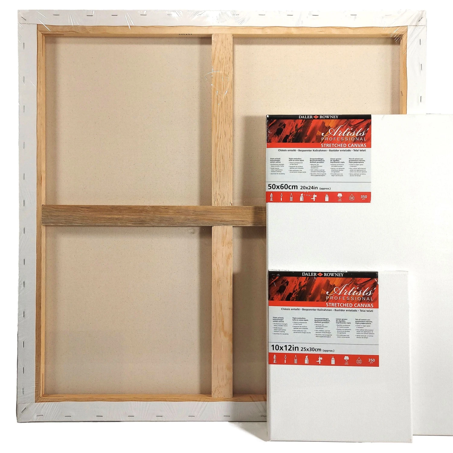 Daler-Rowney Artists’ Stretched Canvases are stapled on the back to give clean edges and come complete with wooden wedges to adjust tension in the traditional manner and they are individually wrapped to protect the surface.