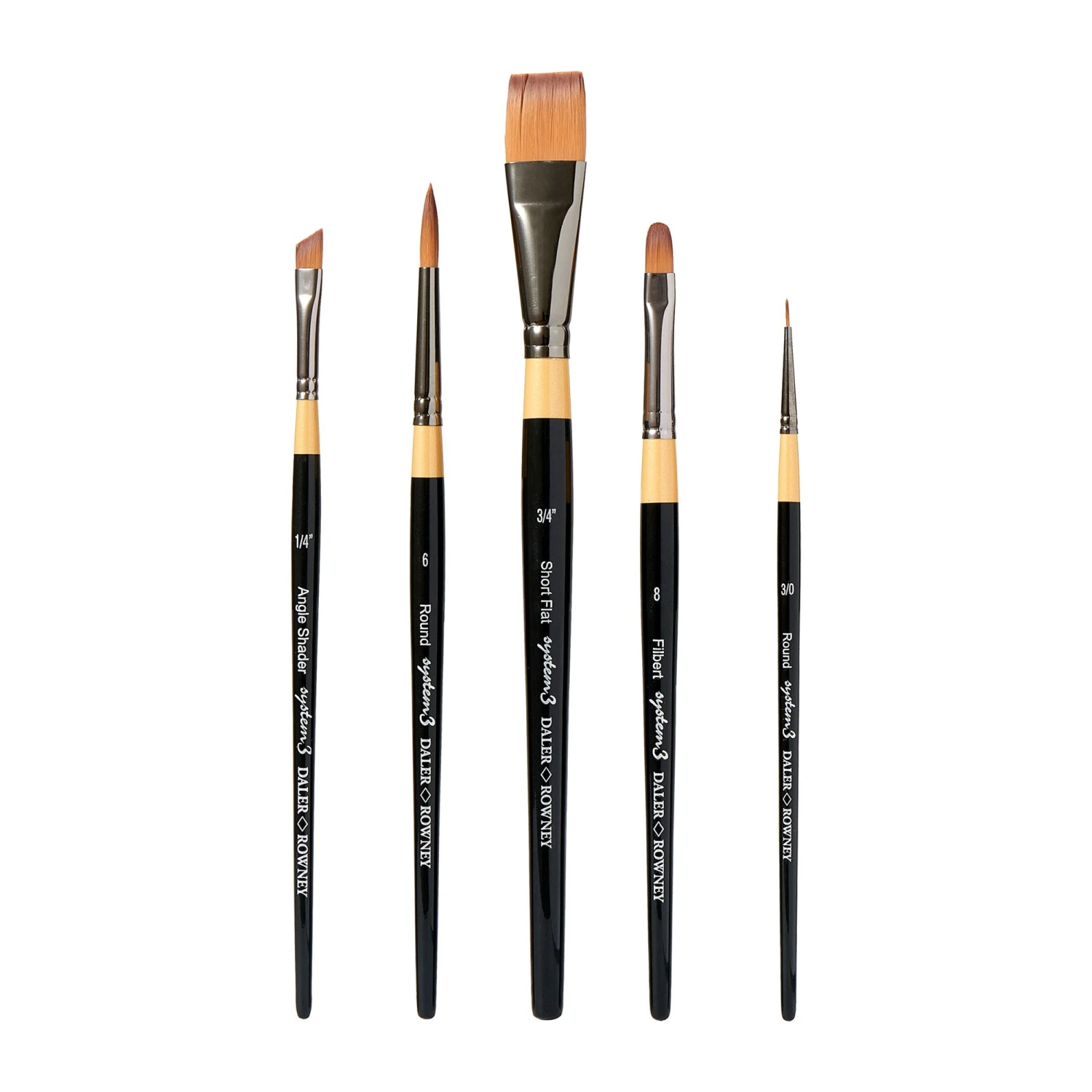 This assortment of 5 System3 short handled brushes is an ideal set of art & craft painting tools, great for beginners and enthusiasts alike. System3 short handled brushes are suited best for acrylic painting and feature soft synthetic filaments that give a good snap and perfect spring ideal for thin to medium flow acrylic colours.