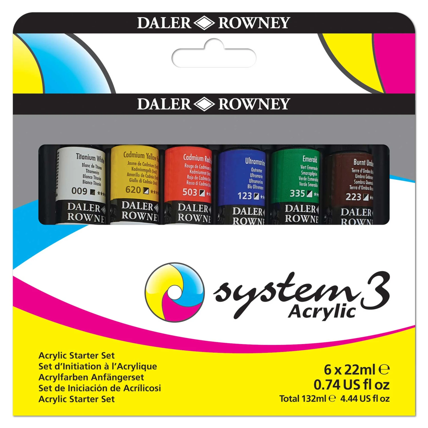 Daler-Rowney System3 Acrylics are versatile water-based colours made from high-quality pigments. This set contains a selection of six 22ml tubes of paint, forming a perfect starting point for beginner artists interested in working with acrylics, or a great resource for those who want to top up their collection.