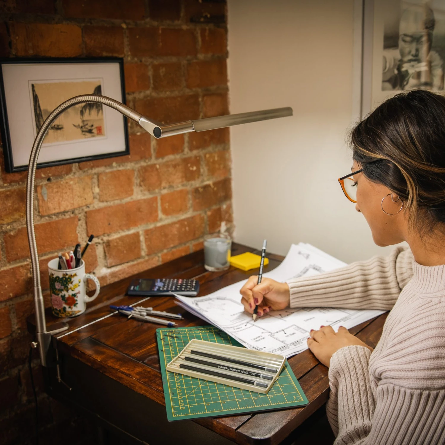 The only lamp on the market that was truly designed for mounting on an easel, the Techne can also be attached to a drafting table, drawing board or a work bench. It comes with a universal easel metal clamp and a G-clamp for moving it from your easel to your drawing station. The arm allows a 360° shade rotation and 320° swivel. When working on an easel or at a table the Techne lets you direct the light to the specific area you are working on – for close-up precision and attention to detail. Awaken the artist in you!