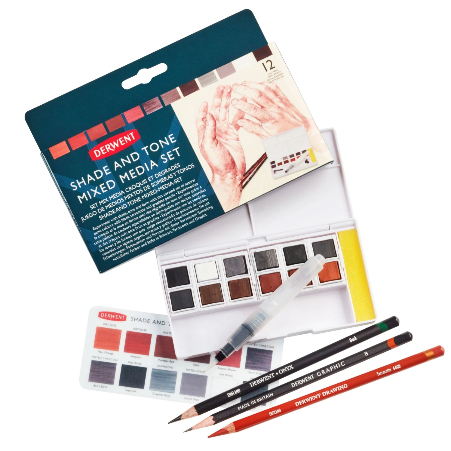- Set contains 7 Inktense paint pans, 2 Graphitint paint pans, 2 Tinted Charcoal paint pans, 1 Pastel Shades paint pan, 1 Terracotta Drawing pencil, 1 Dark Onyx pencil, 1 B Graphic pencil , with a mini water brush, sponge and 5 mixing palettes.