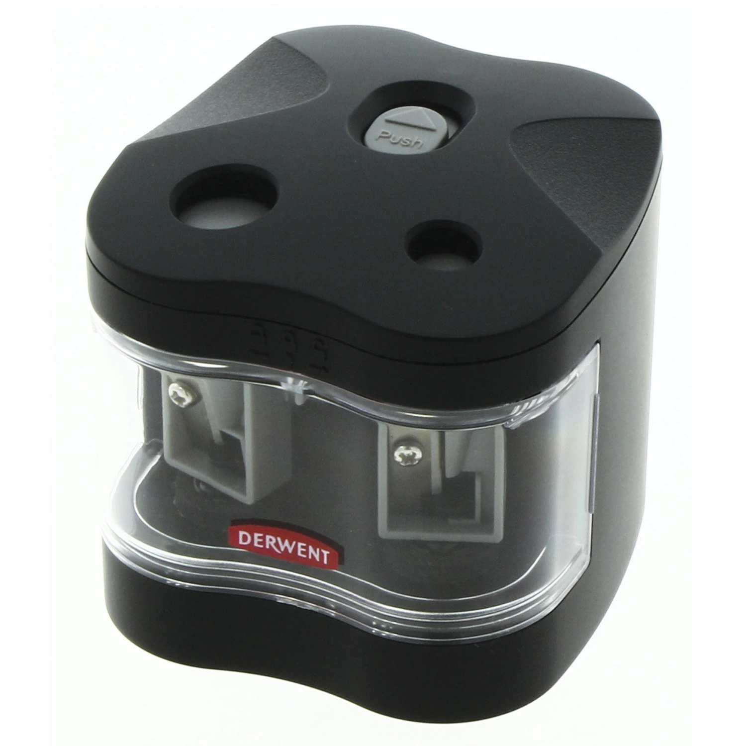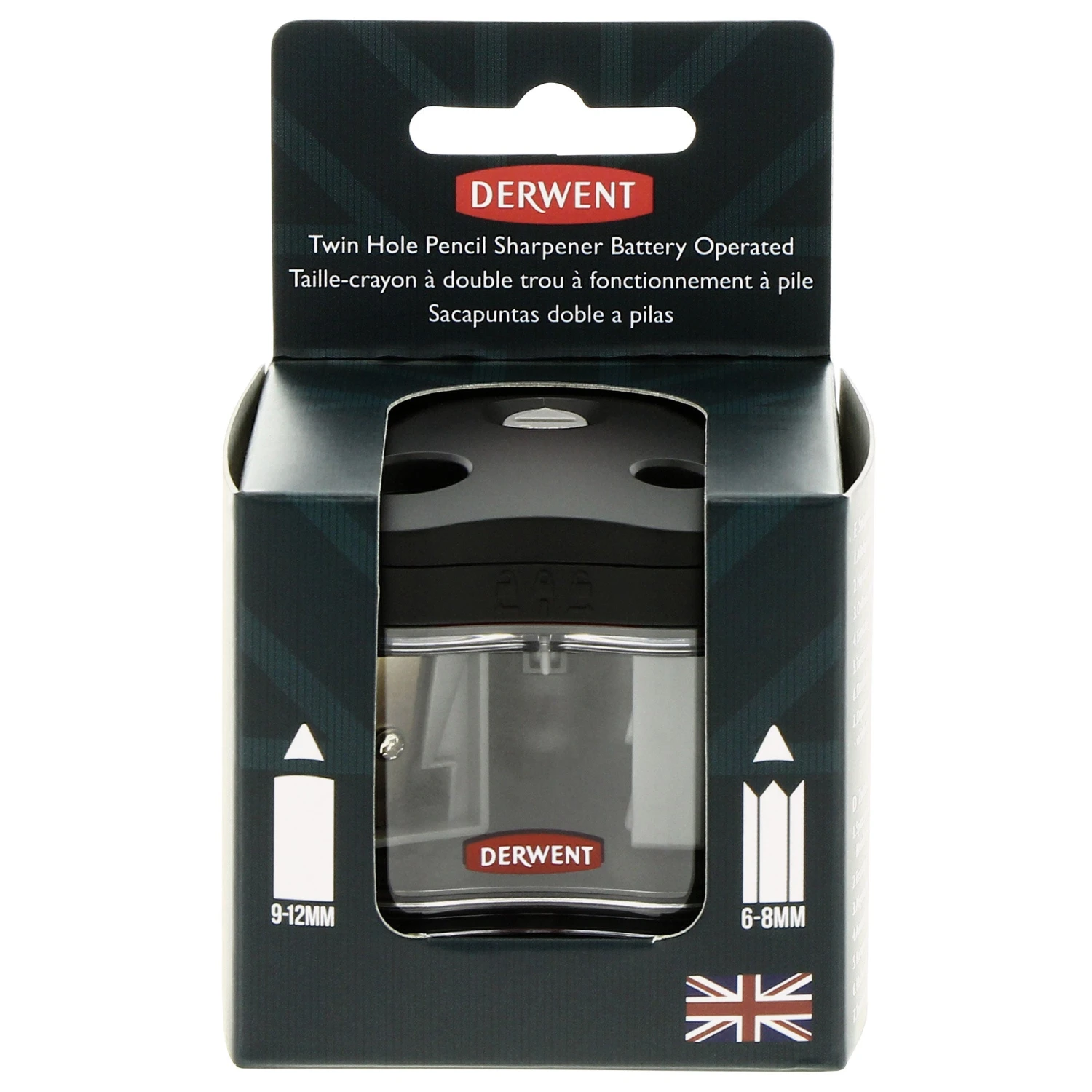 The Derwent Battery Operated Twin Hole Sharpener can sharpen both large (9-12mm) and small (6-8mm) diameter pencils, perfect for achieving a sharp point quickly. The compact size is ideal for taking out and about.