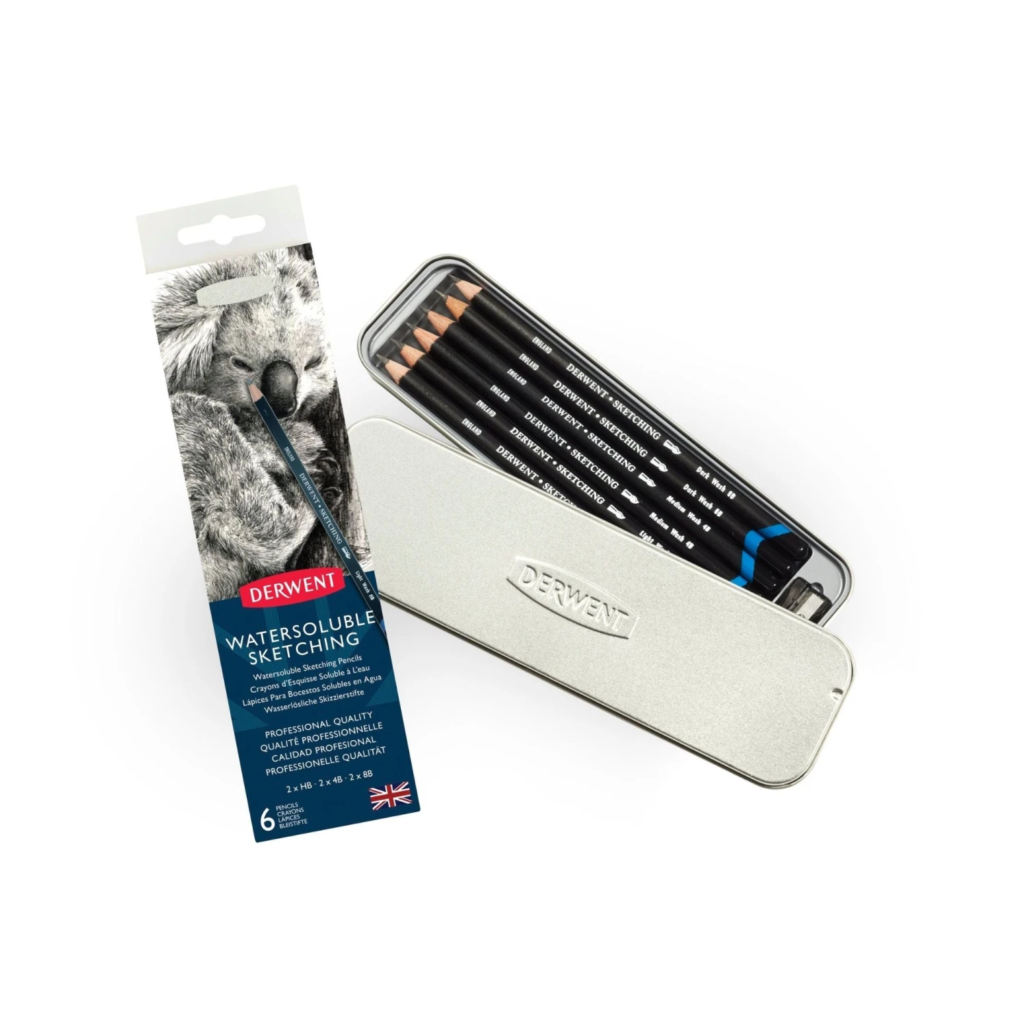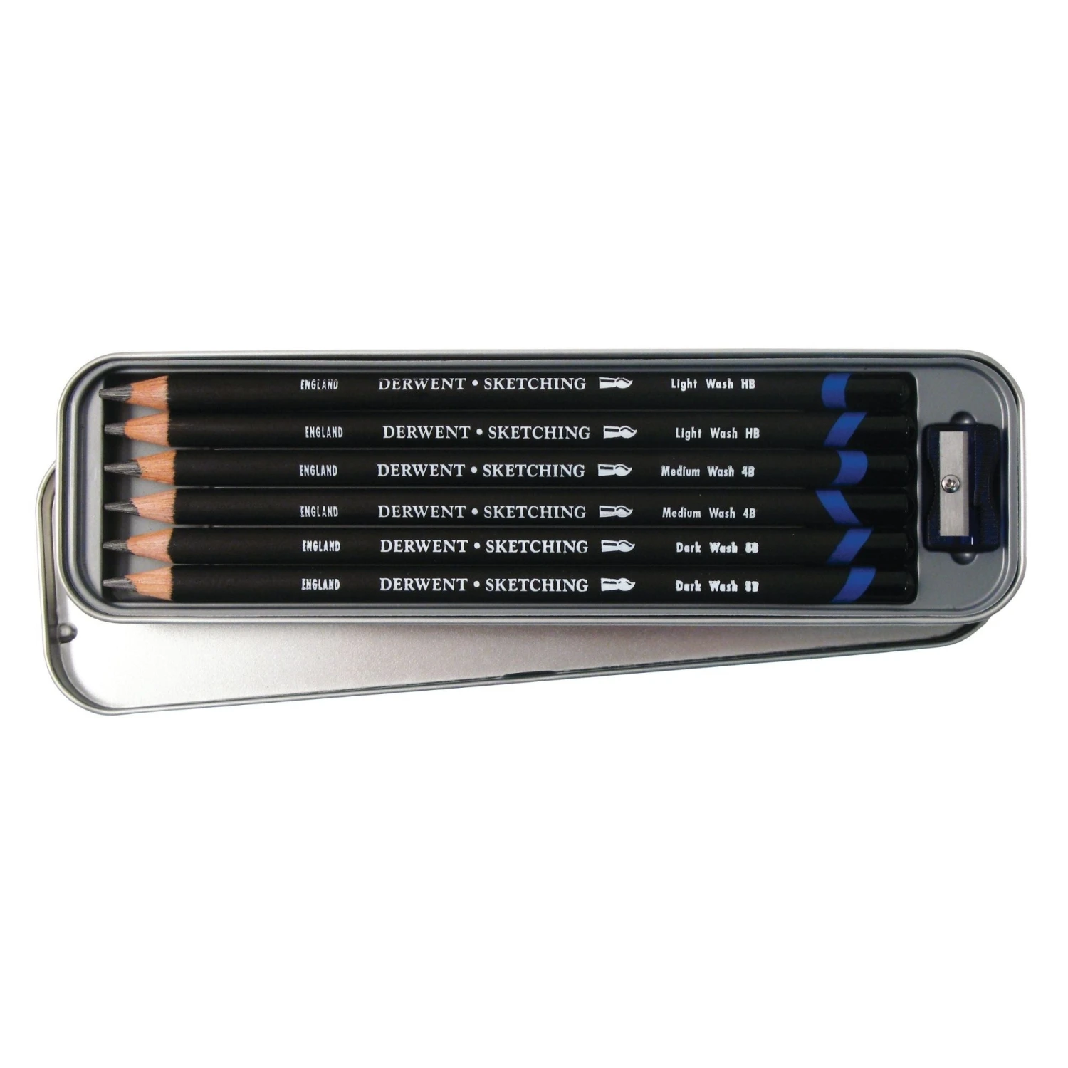 Contains: 2 x HB, 2 x 4B and 2 x 8B + A free sharpener. Contained in a handy, easily portable tin.