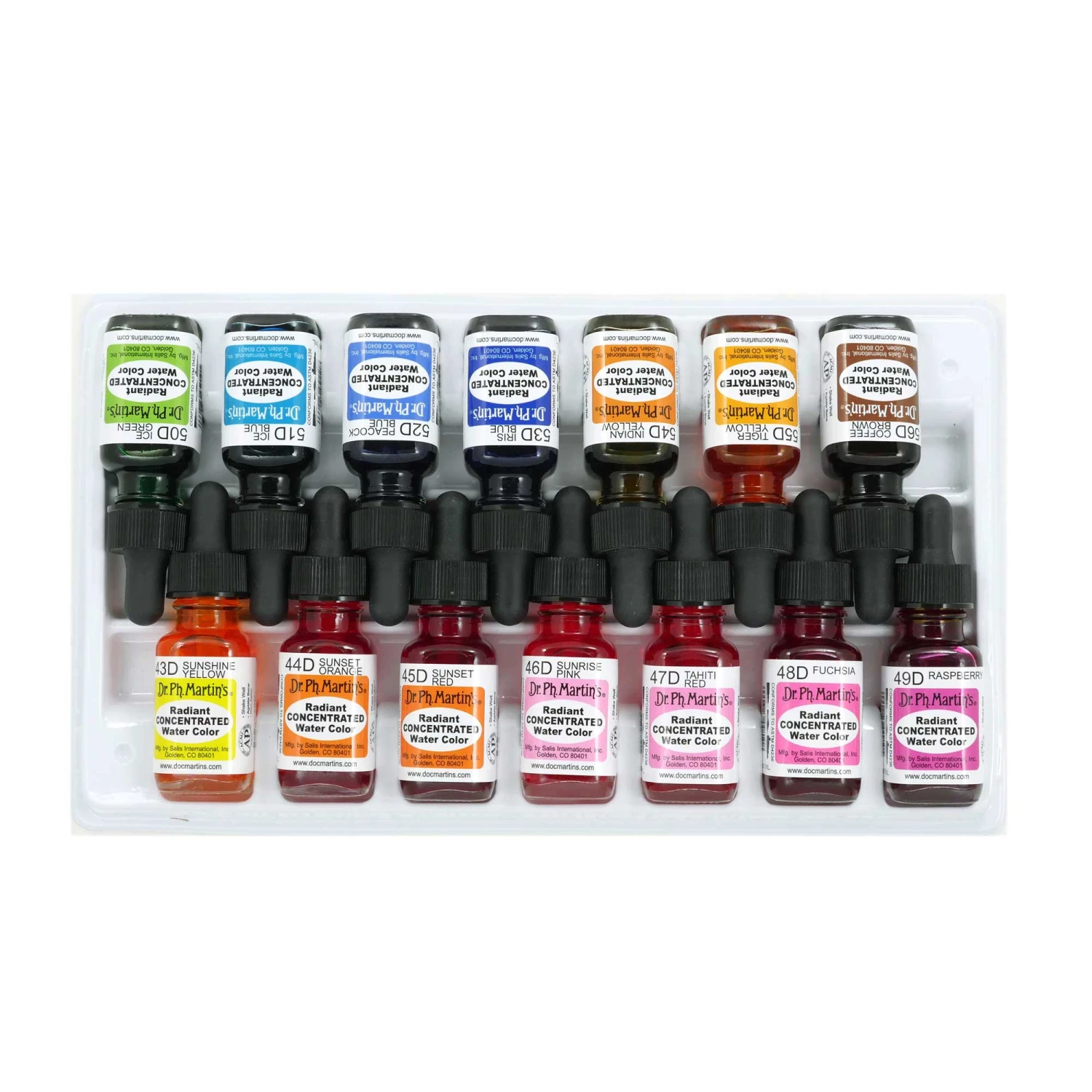 Dr. Ph. Martin’s Radiant Concentrated Water Colour is produced in an extremely concentrated form to achieve the greatest possible brilliance. Each liquid colour comes in an iconic 0.5 oz (15 ml) glass bottle package with its own eyedropper.