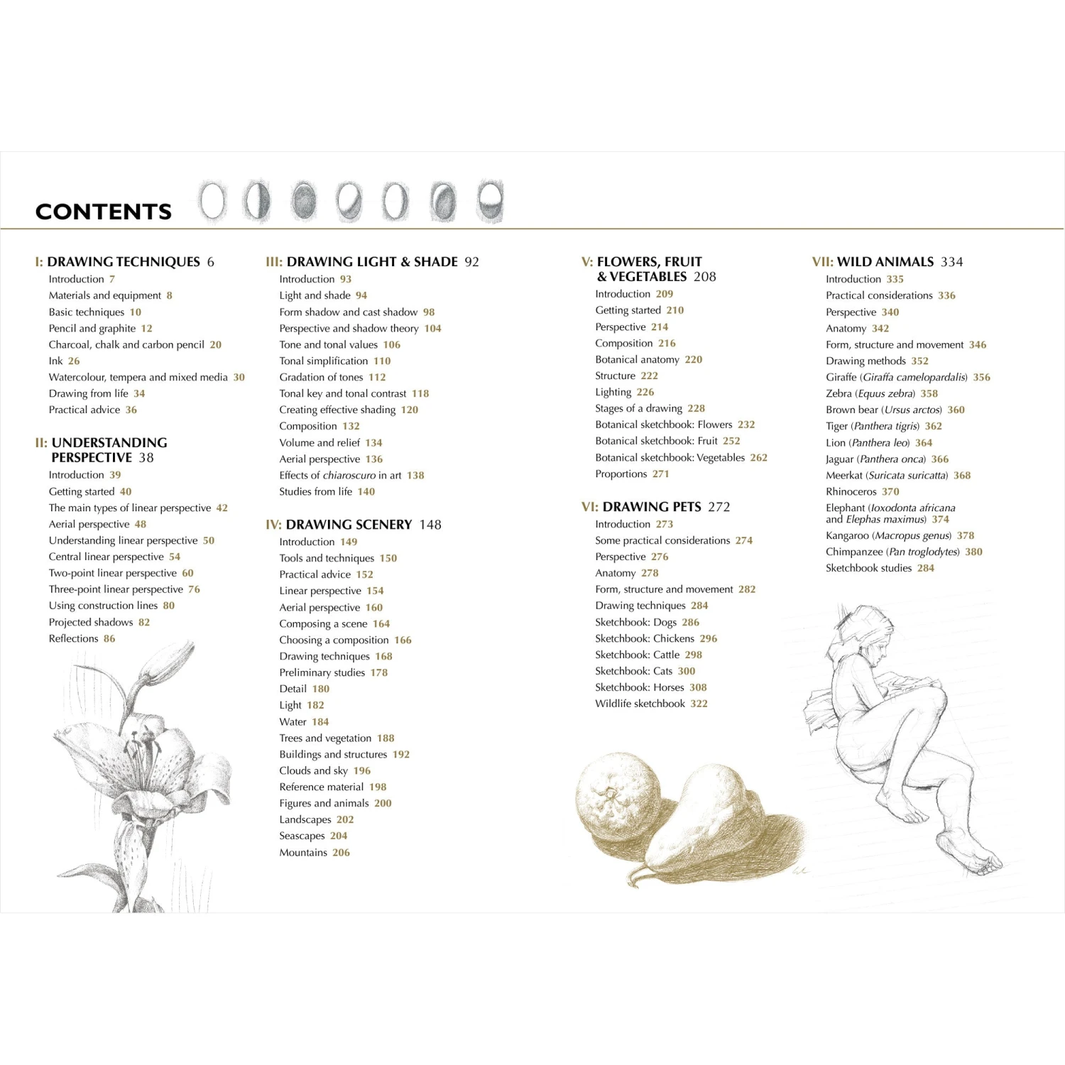 This comprehensive guide brings together seven books from Search Press’s successful Art of Drawing series: Drawing Techniques; Understanding Perspective; Drawing Scenery; Drawing Light & Shade; Flowers, Fruit & Vegetables; Drawing Pets; and Wild Animals.