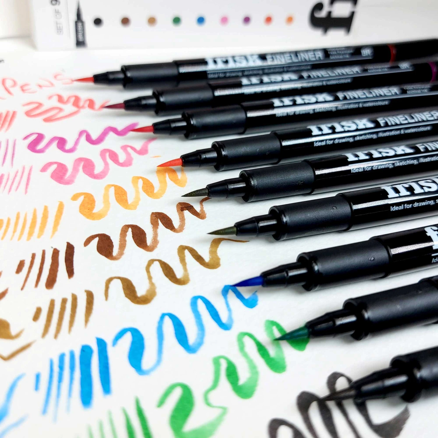 An assorted set of 9 Frisk Coloured Fineliner Brush Pens, ideal for drawing, sketching, watercolours, and more. Their felt brush tip allows for an incredible variety of line widths to be used, from the smallest of details to colouring large swaths of an image.