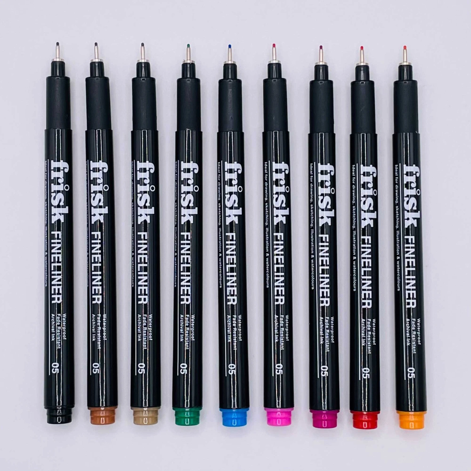 An assorted set of 9 Frisk Coloured Fineliner Pens, ideal for drawing, sketching, watercolours, and more. Their 0.5mm nibs allow for very precise and consistent lines to be added to illustrations, great for detailing and adding colourful linework.