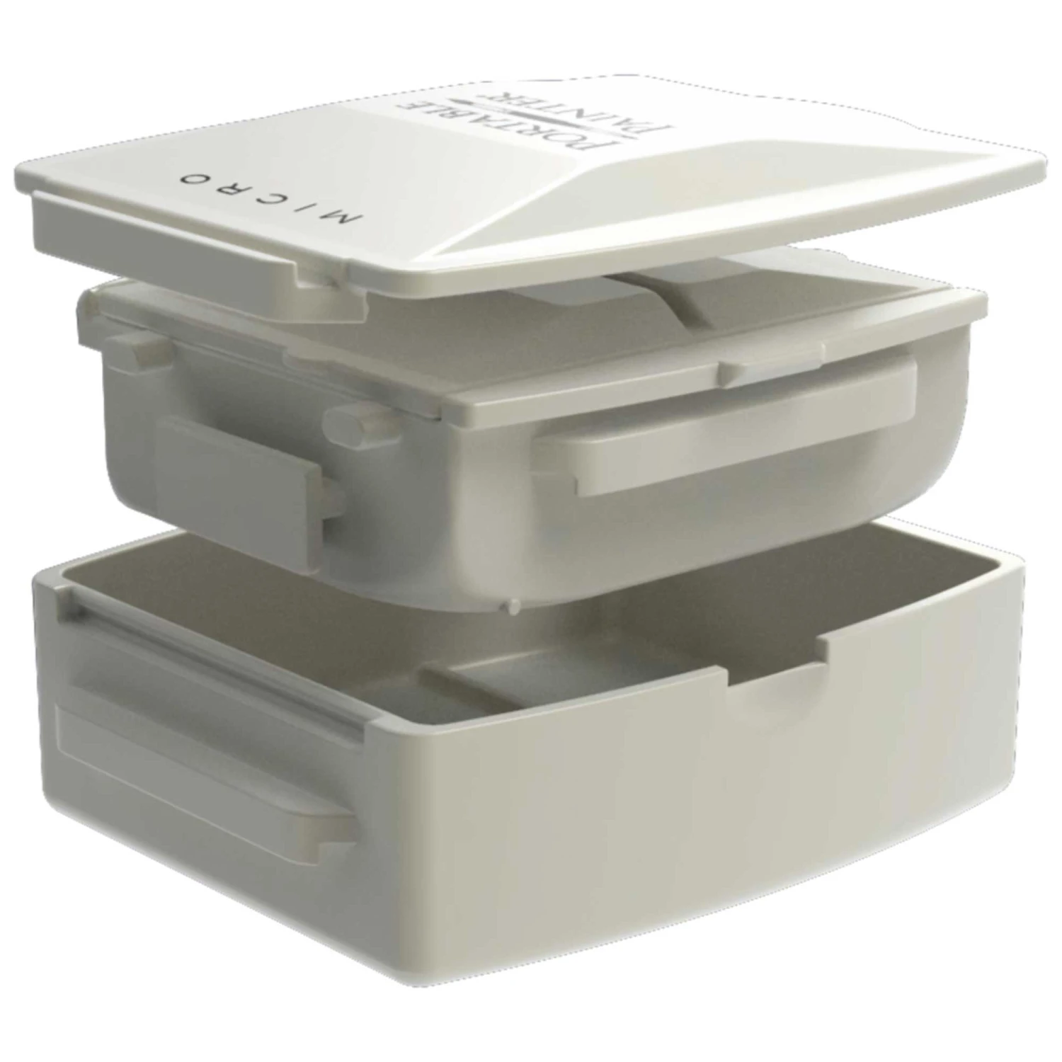 While the Portable Painter Micro is just credit card size and one inch thick, it transforms in seconds to a fully self-contained watercolour system with plenty of deep mixing wells, a convertible water container and room for up to six of your favourite colours. It includes a sturdy, T-shaped finger grip on the base and a lanyard hole.