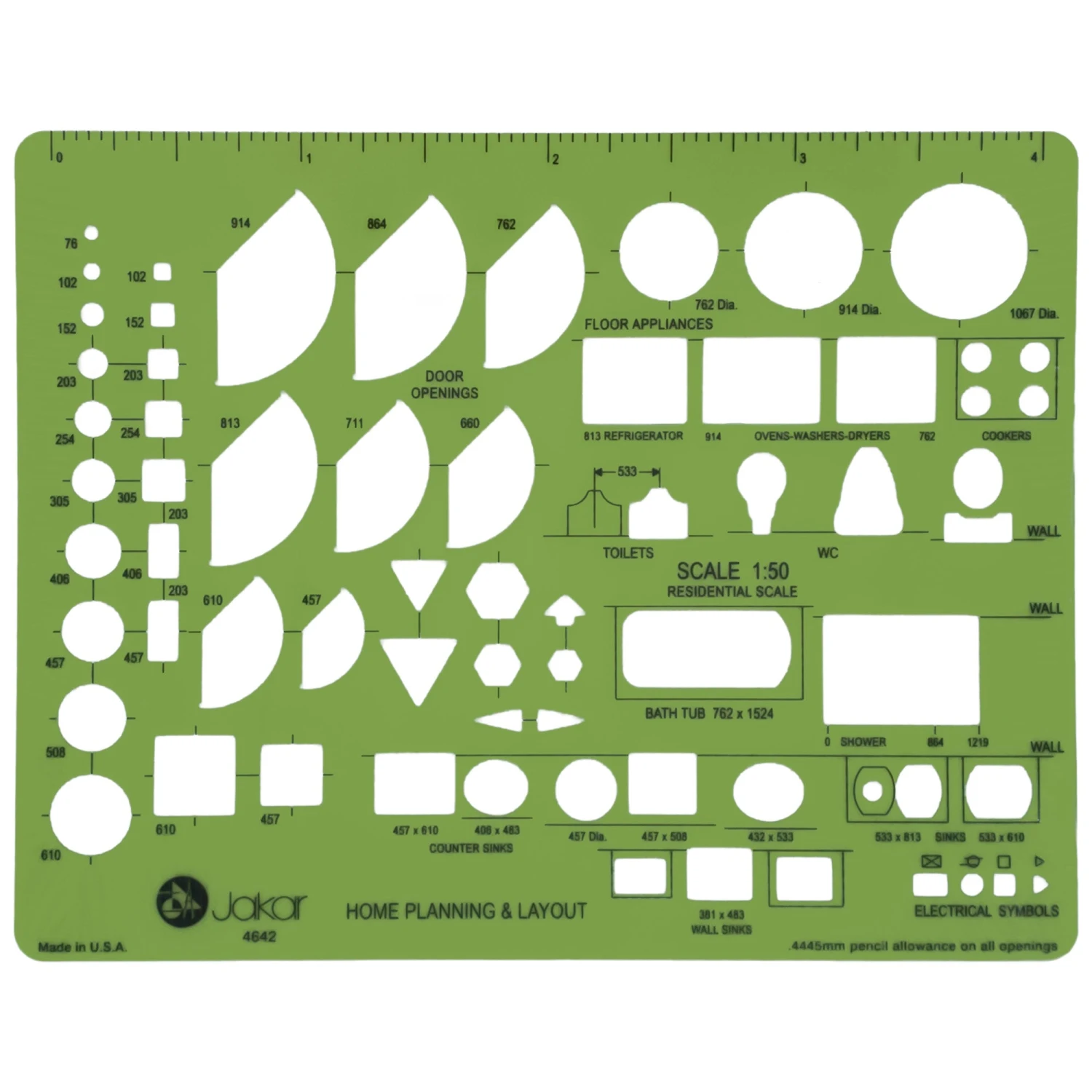 The Jakar Home Planning & Layout Template features a selection of symbols for home planning, including essential features such as kitchen and bathroom appliances.