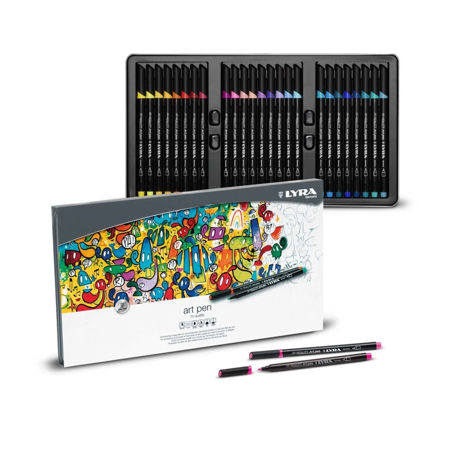 This metal box contains 50 quality felt-tip pens which you can use for many different types of artwork, from artistic design, to drawing and sketching, and more. The tips are made from super-tough fibres, to ensure that your lines are always clean and precise. The water-based inks are clear, bright and resistant to fading. The Lyra Hi-Quality Art Pen is a unique way to unleash your creativity!