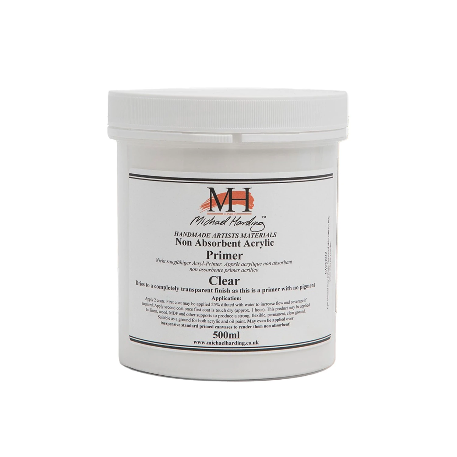 Michael Harding Non-Absorbent Clear Acrylic Primer is designed to be applied to a coloured surface where the artist wishes to preserve or enhance a supports’ natural colour — such as raw linen or wooden panels. The support will become slightly darker because of the Clear Transparent NAAP application.