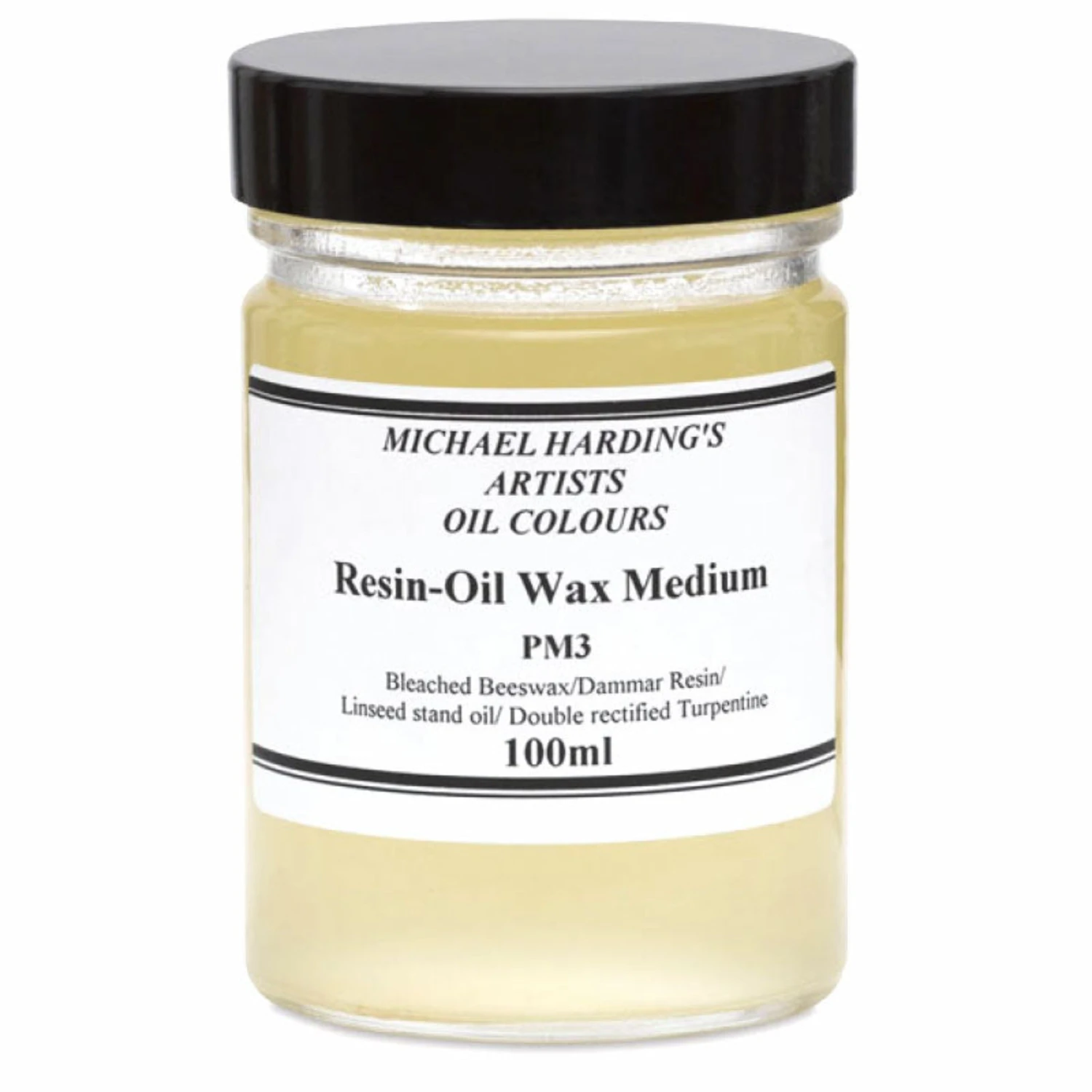 Michael Harding Resin Oil Wax Medium is a soft painting paste, derived from pure bleached beeswax then mixed with dammar resin and linseed stand oil. This medium creates a satin sheen and gentle impasto in paint layers. Settling of the medium may occur so allow the jar to stand in hot water and stir contents until dissolved.