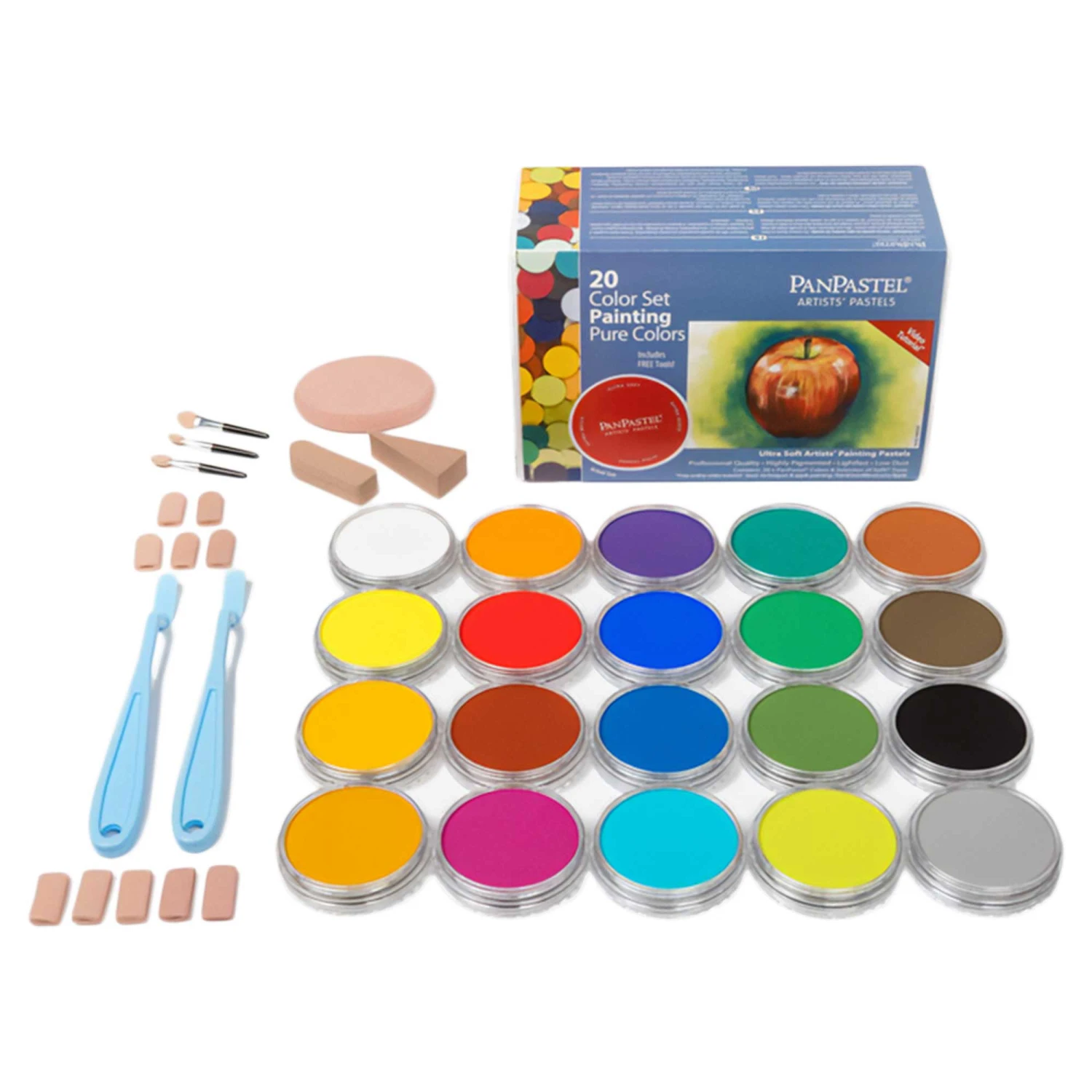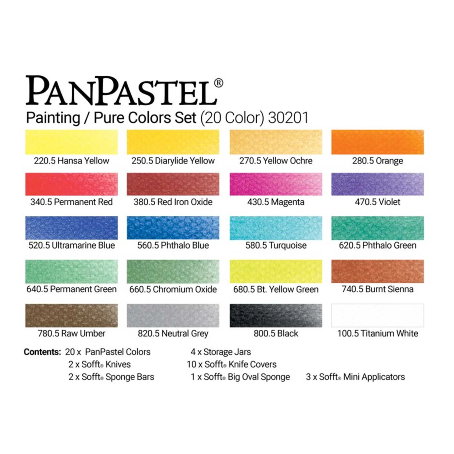 This set includes 20 PanPastel colours, two Sofft Knives (No. 1 & No. 2), 10 Sofft Knife Covers (No. 1 & No. 2), three Sofft Sponges, three Sofft Applicators, four storage jars, and one Sofft Big Oval Sponge.