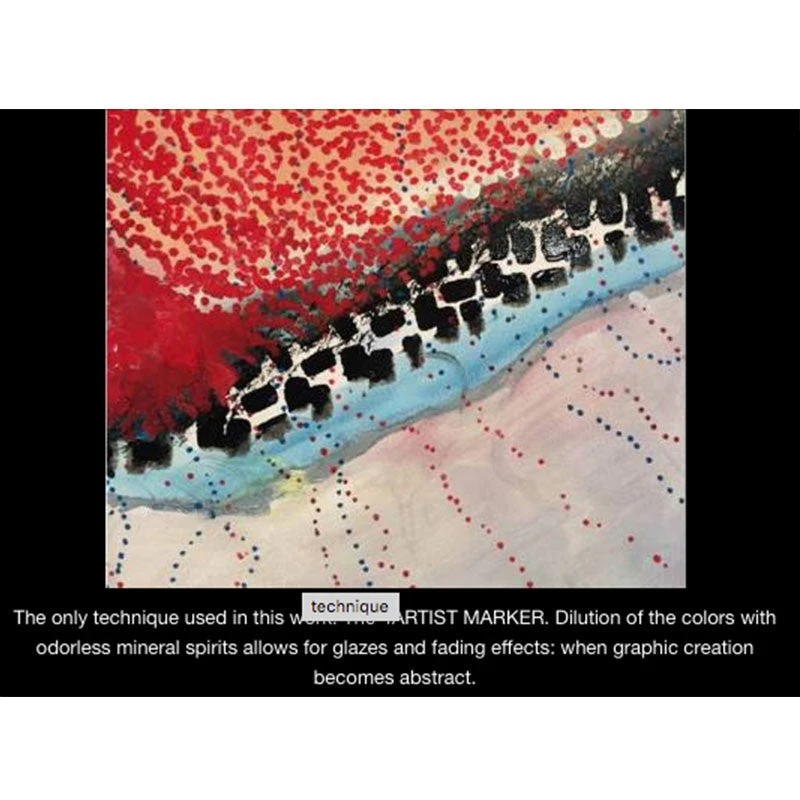 The 4Artist Marker is ideal for use in mixed media applications and can be used with fine arts and graphic arts paints (oil, acrylic and auxiliaries, inks, etc.), or with Pébéo specialty paints such as Ceramic, Vitrail, Fantasy Prisme, Fantasy Moon and Gédéo resins.