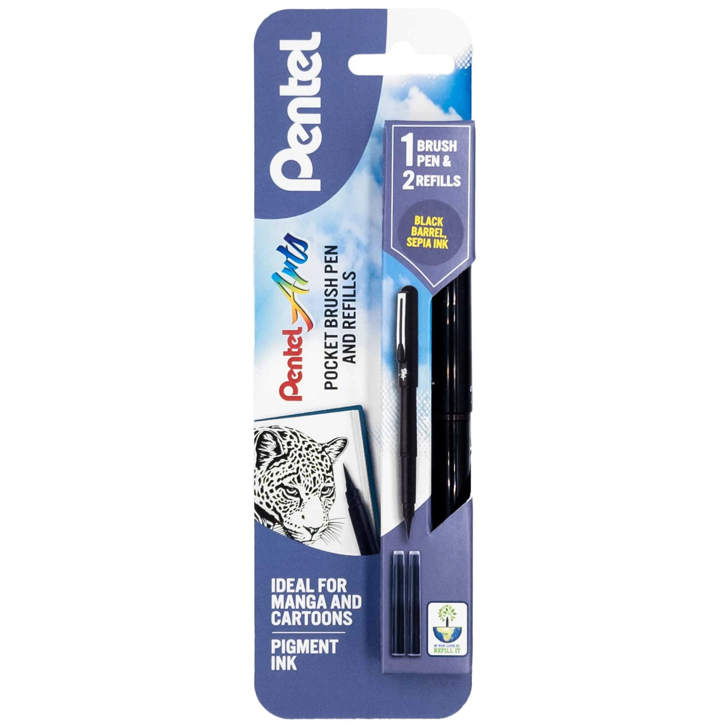 With a refillable barrel and a brush tip that maintains its shape, Pentel’s Brush Pen gives constant, yet controlled ink flow to produce fine detail and the authentic long, sweeping strokes of traditional artwork. The convenient refill cartridge is supplied with dense black pigment ink which can be used on almost any surface, from artboard to handmade paper.