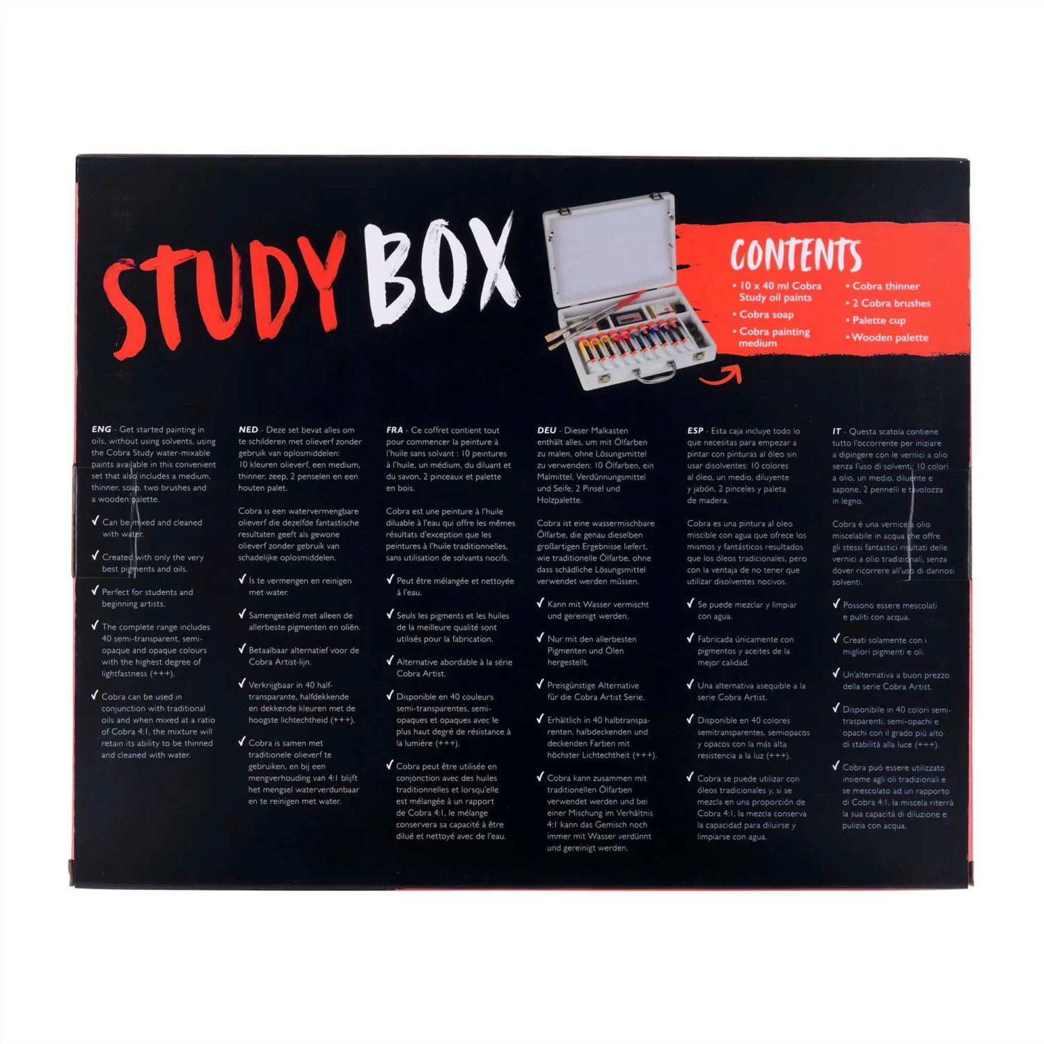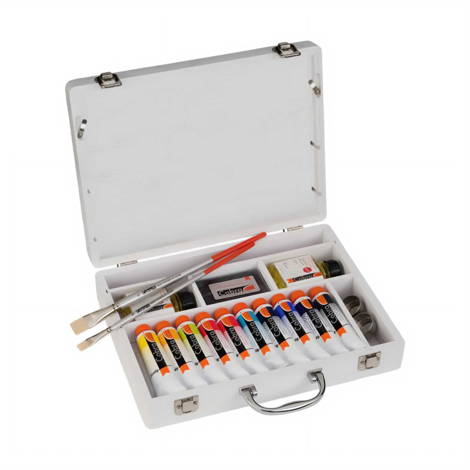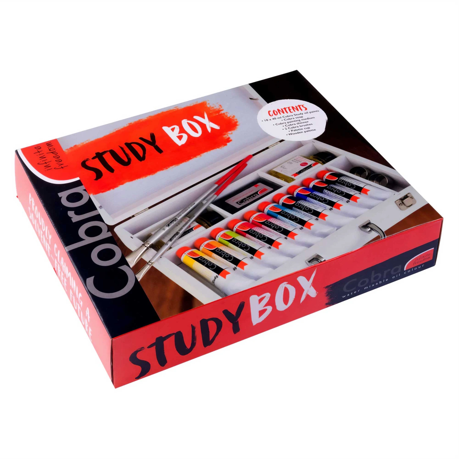 This convenient box contains everything you need to start painting with oil paint, without having to use solvents. The set includes a selection of ten Cobra Study water-mixable oil colours, a bottle of painting medium, solvent-free paint thinner, and various accessories to help you get started.