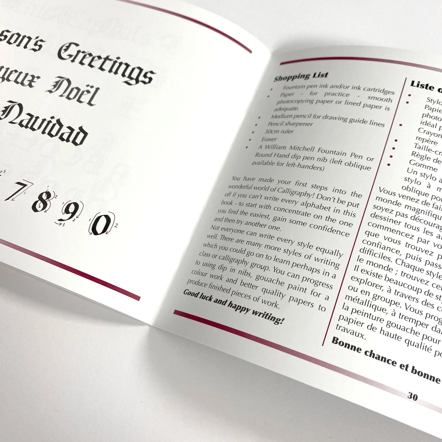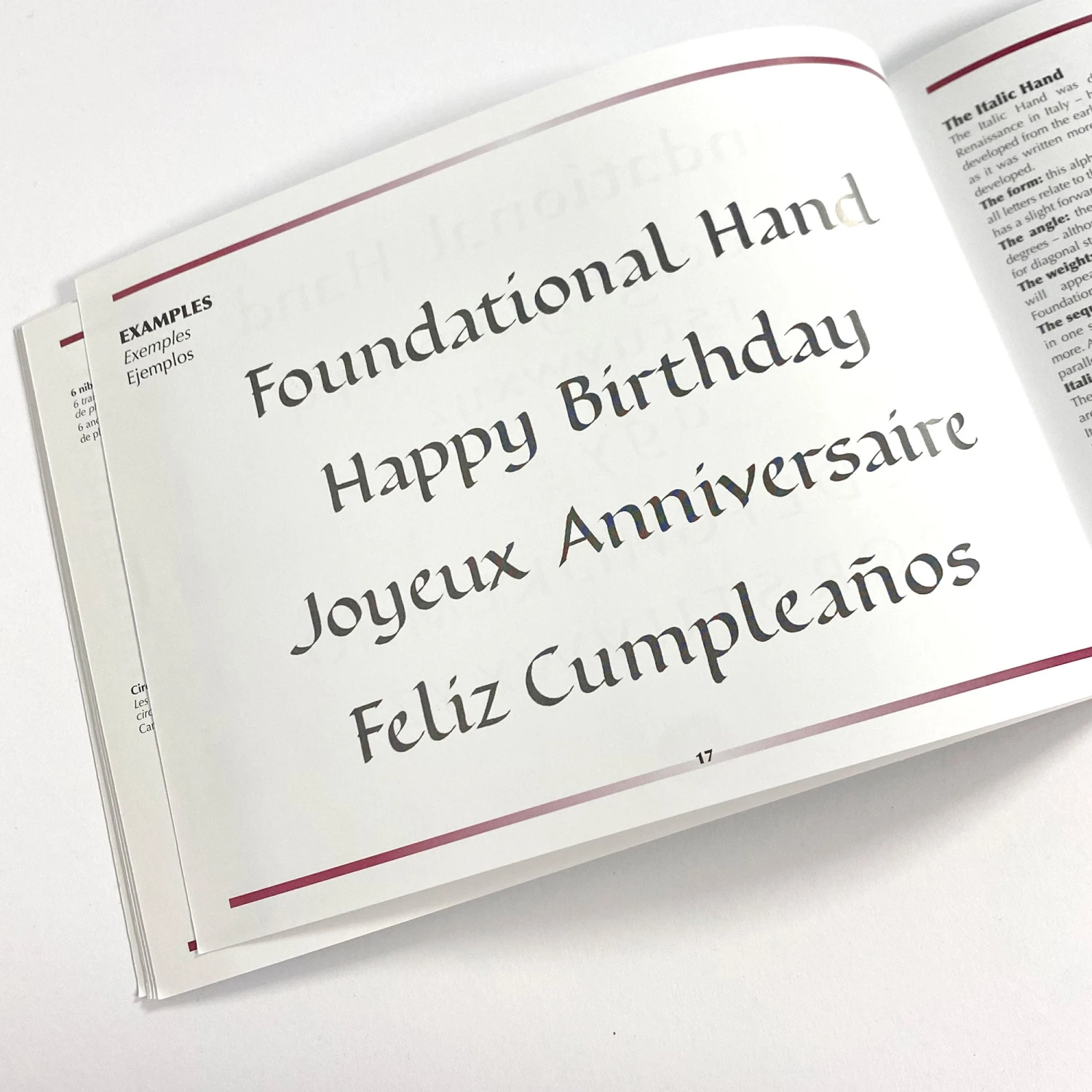 The 30-page A5 size booklet serves as an introduction to fundamental techniques, providing explanations for calligraphy terms and guiding you through the process of writing the four distinct alphabets:Â Foundational (Round Hand) Italic, Gothic and Uncial.
